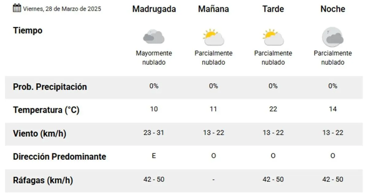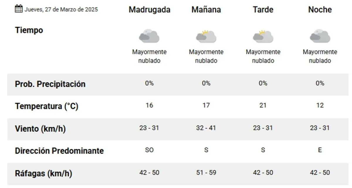 Según el Servicio Meteorológico Nacional, la madrugada comenzará con una temperatura de 16°C y un cielo muy nublado. A lo largo del día, se espera que el viento sople desde el sudoeste con ráfagas que oscilarán entre 42 y 50 kilómetros por hora.