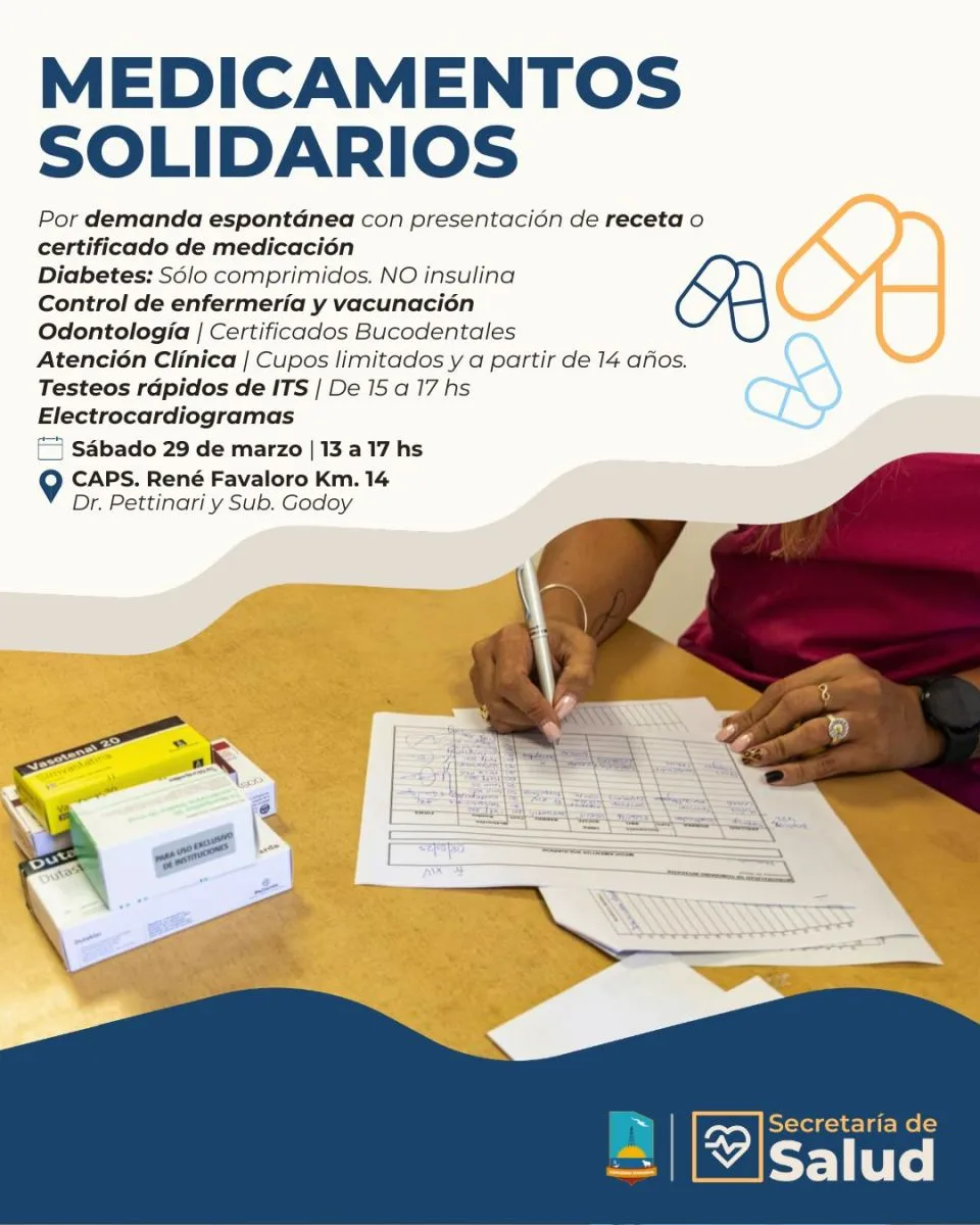 Contempla la medicación para la cobertura de tratamientos en patologías crónicas como: diabetes, dislipemias, artrosis, hipertensión, entre otras. La actividad se realizará este sábado de 13 a 17 horas en el CAPS René Favaloro de Km. 14, donde habrá otras atenciones para atender la demanda de los vecinos de zona norte.