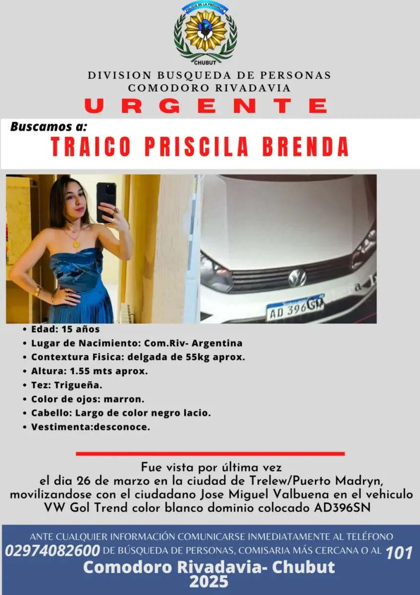 La División de Búsqueda de Personas de Comodoro Rivadavia emitió una alerta urgente para dar con el paradero de Priscila Brenda Traico, una joven de 15 años que fue vista por última vez el 26 de marzo en Trelew o Puerto Madryn.