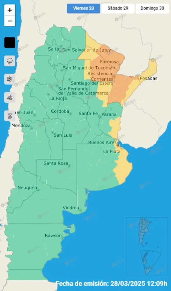 Para la jornada de este viernes, el SMN no emitió alertas por tormentas para la región de Córdoba, pero sí para el norte de Santa Fe (en color amarillo). En tanto, el organismo meteorológico, extendió un aviso de color naranja por temporales para Chaco, Corrientes y Formosa.