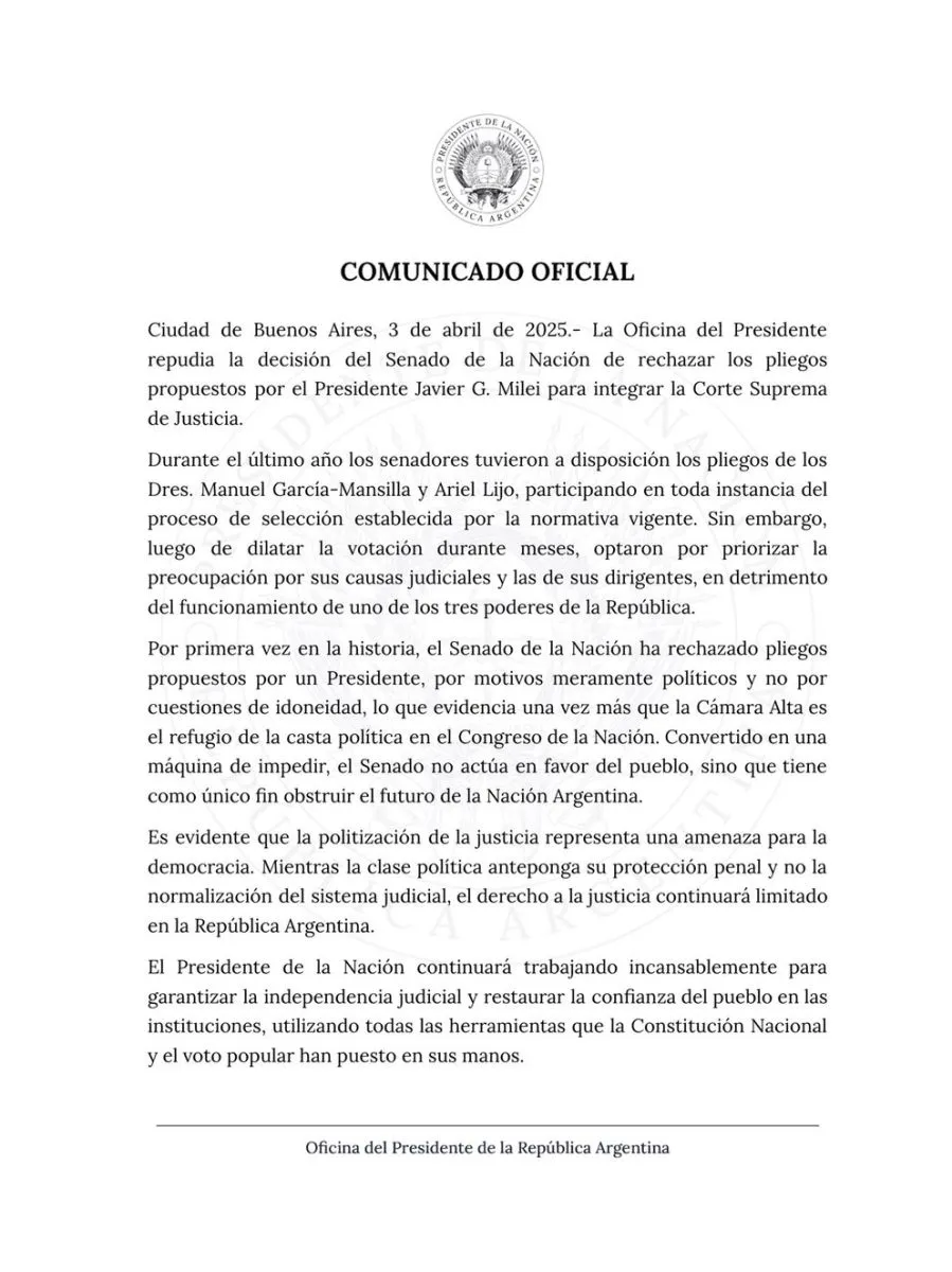 El Gobierno remarcó que se trata de la primera vez en la historia que el Senado rechaza pliegos presidenciales para la Corte “por motivos meramente políticos”, lo que a su juicio “evidencia una vez más que la Cámara Alta es el refugio de la casta política en el Congreso de la Nación”.