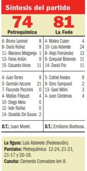 La Fede quedó como líder del torneo local de básquetbol de primera división al vencer de visitante 81 a 74 a Petroquímica, mientras que Náutico se recuperó y superó a CAI. Hoy se completará la jornada del Apertura en el Socios Fundadores con el juego entre Gimnasia y Mosconi de Caleta Olivia.