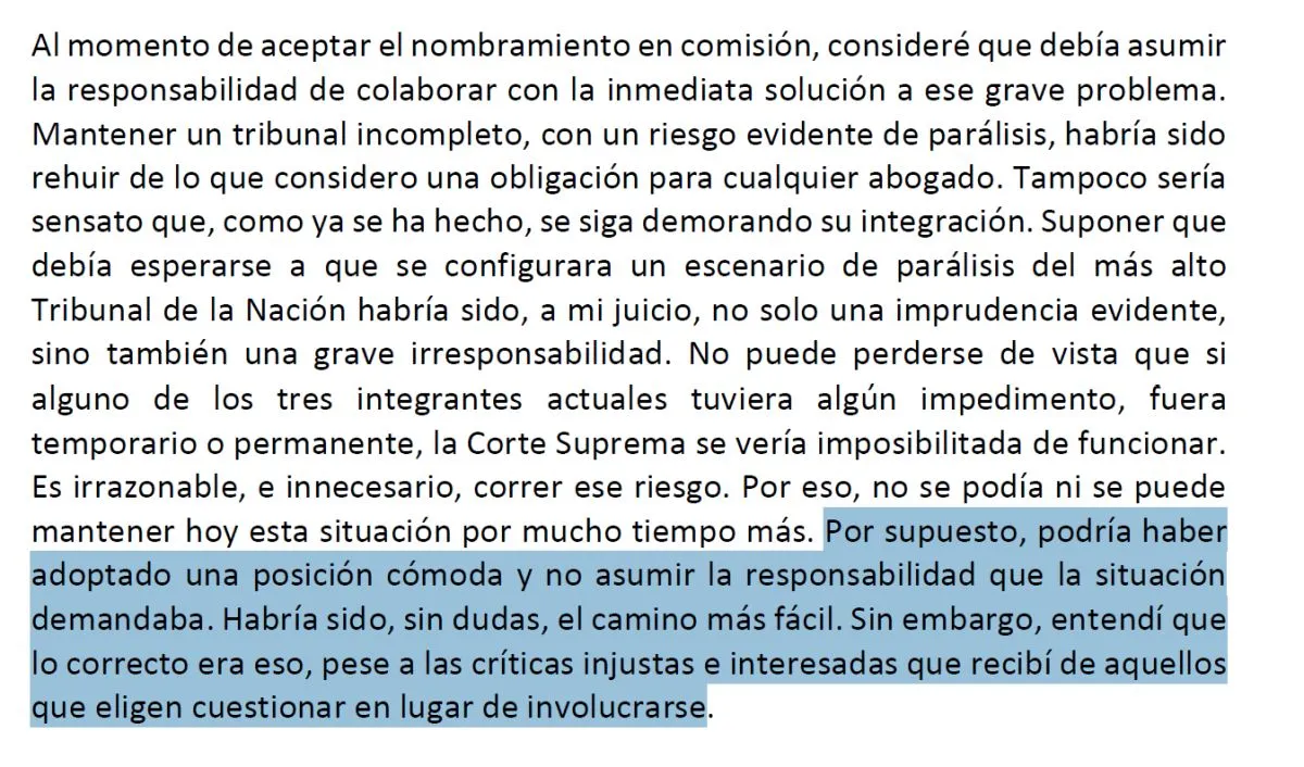 El magistrado sostuvo: “a esa anomalía institucional se le había sumado una nueva vacante, que agravó aún más la situación y que, incuestionablemente, requería también ser cubierta sin dilaciones”. En el mismo sentido, advirtió sobre “la falsa creencia de que la Corte Suprema puede funcionar con solo tres jueces”, algo que definió como un “espejismo institucional que puede causar un daño incluso mayor que el que ya ha causado la demora en integrar el Tribunal”.