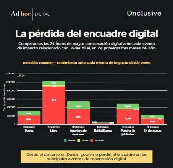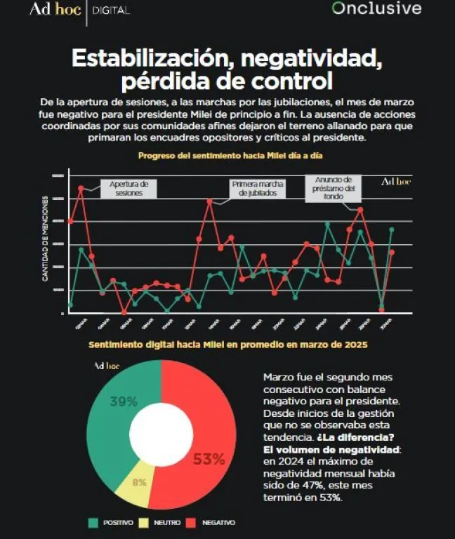 La tendencia descendente refleja un deterioro en la percepción pública digital del mandatario y su espacio, impulsado por una serie de episodios que marcaron la agenda política y económica del mes de marzo. Según la consultora Ad Hoc, en marzo el mandatario cerró con 53% de negatividad total. Se detectaron 5.432.000 menciones vinculadas a Javier Milei, con un 48% negativas, 45% positivas y 7% neutras. “Por primera vez, las menciones negativas sobre el mandatario superaron a las positivas en las redes sociales”, remarca el informe.