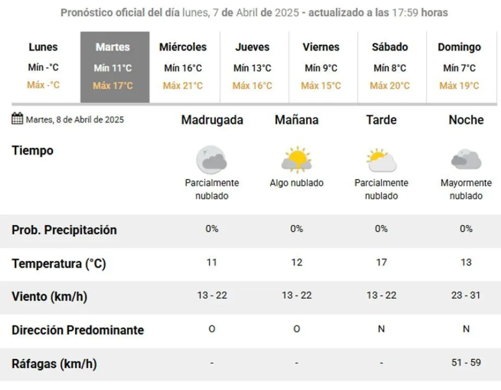 El Servicio Meteorológico Nacional ha compartido su pronóstico para hoy, martes 8 de abril, en Comodoro Rivadavia. Se anticipa que la temperatura mínima será de 11°C y la máxima alcanzará los 17°C.