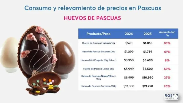 En cuanto a los huevos de Pascua, el producto más pequeño (17g) tuvo un incremento del 85%, al pasar de $570 a $1.055; mientras que el huevo sorpresa de 150 grs. aumentó un 70%, de $12.500 a $21.250.