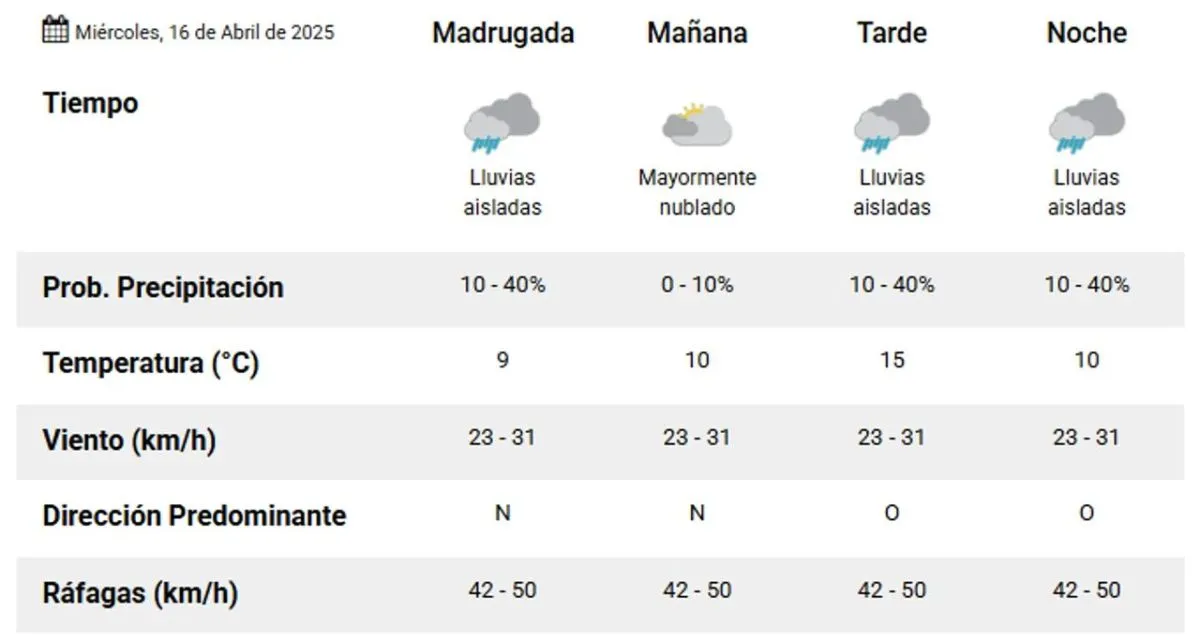 Este miércoles se anticipan lluvias aisladas acompañadas de vientos de intensidad variable, en una jornada que se presentará fría.
