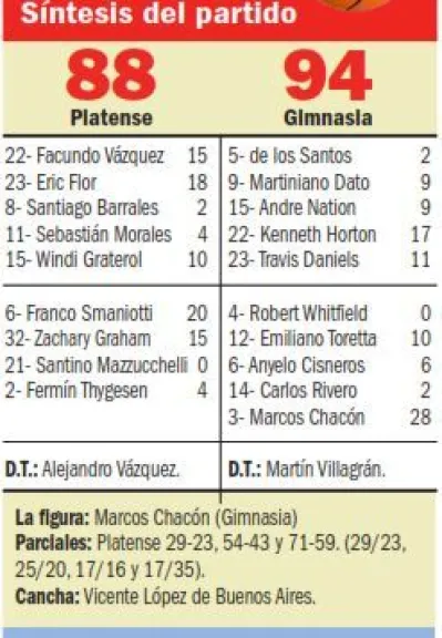 Con una fenomenal actuación del cubano Marcos Chacón, 6/6 en triples y 22 puntos en el último cuarto, Gimnasia le ganó 94 a 88 a Platense en Buenos Aires, al corregir un partido que le venía siendo muy desfavorable -llegó a perder por 19- y que le sirve para seguir ascendiendo en la Liga Nacional de básquetbol.