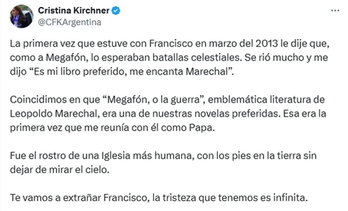 "Fue el rostro de una Iglesia más humana, con los pies en la tierra sin dejar de mirar el cielo. Te vamos a extrañar, Francisco. La tristeza que tenemos es infinita", concluyó la ex presidenta en su mensaje.