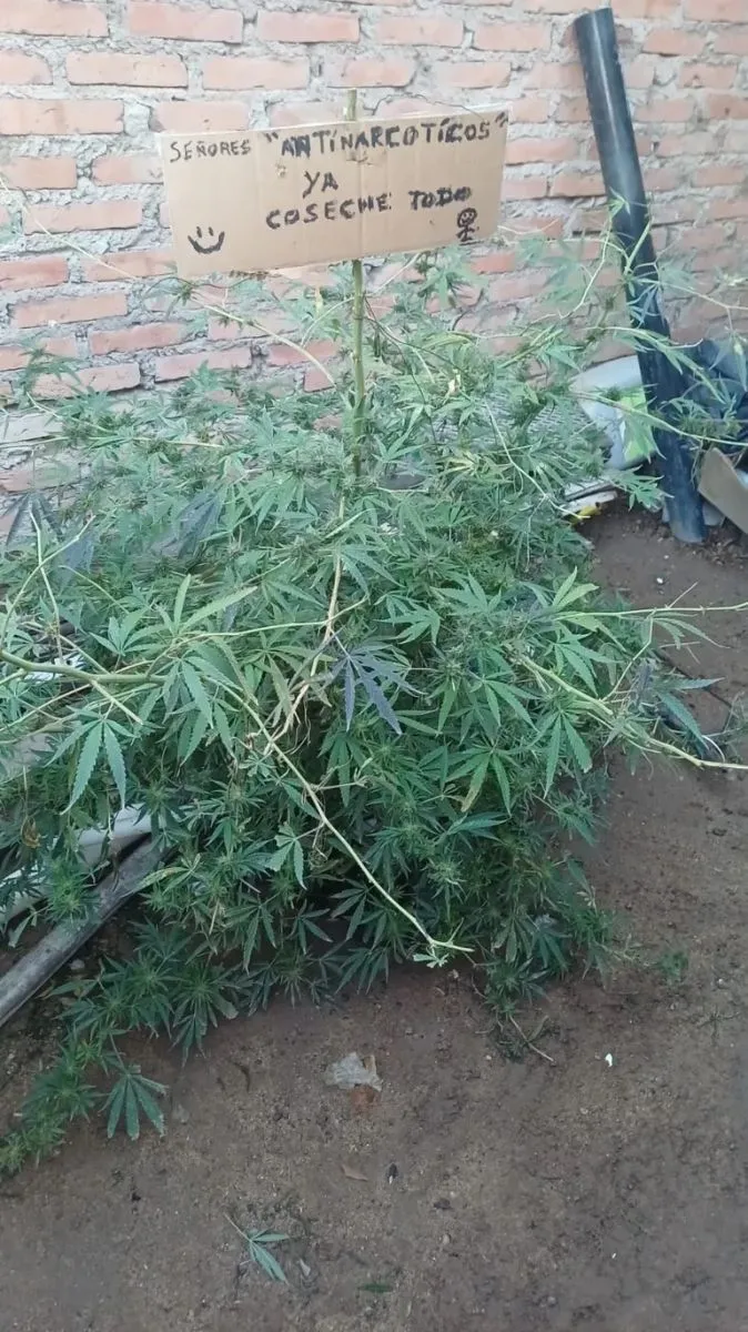 "Señores 'antinarcóticos', ya coseché todo", decía el cartel, elaborado sobre un trozo de cartón y colgado de la rama principal de una planta de cannabis sativa. El mensaje estaba acompañado por un dibujo de una cara feliz y una figura humana realizados con marcador negro. En ese mismo patio había al menos diez plantas ya cosechadas. Dentro del domicilio, además, hallaron un armario adaptado como cultivo indoor con dos plantas florecidas, papelillos, una bandeja con flores y un picador.