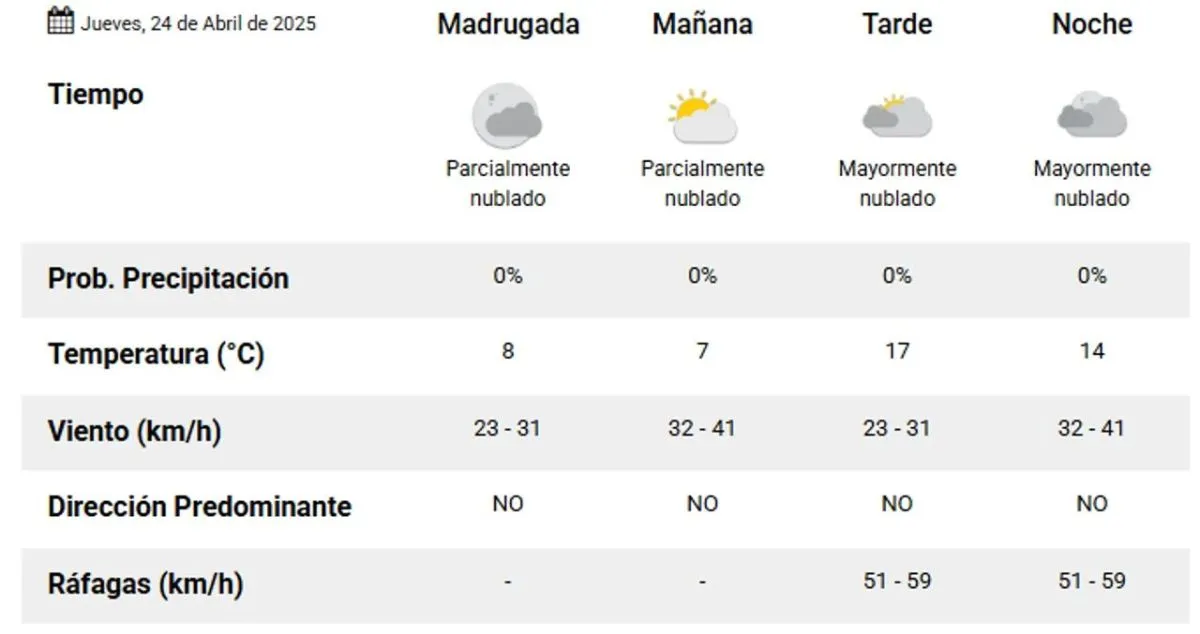 A medida que avance la tarde, se anticipa una máxima de 17°, con un aumento en la nubosidad y el inicio de ráfagas leves provenientes del noroeste, que alcanzarán entre 51 y 59 kilómetros por hora. Esta misma situación continuará durante la noche, cuando la temperatura caerá a 14°.