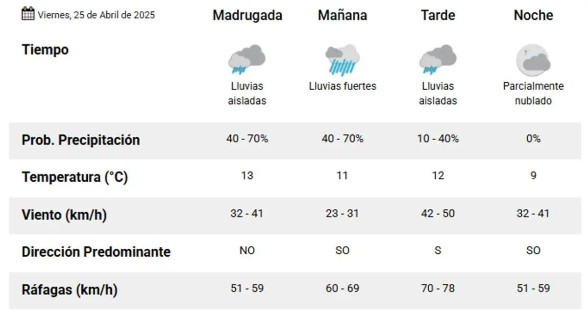 Para el viernes, se pronostican lluvias que irán aumentando gradualmente, siendo la mañana el momento en que las precipitaciones se intensificarán, acompañadas por ráfagas con la misma frecuencia.