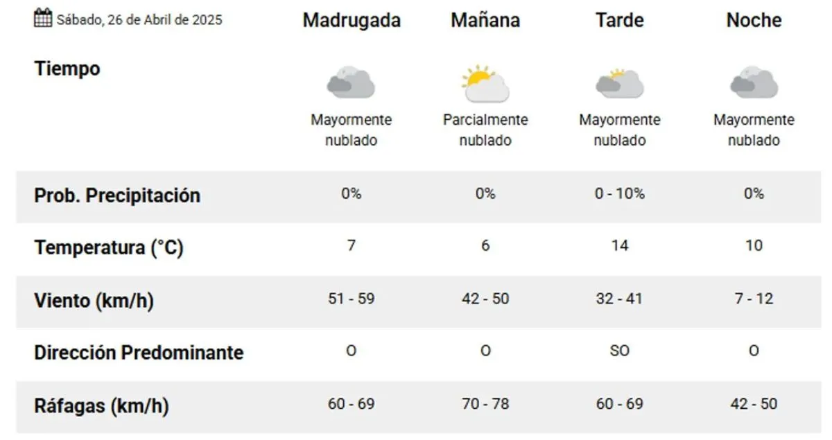 Durante la madrugada, se prevé una temperatura de 13° con posibilidad de lluvias dispersas y ráfagas provenientes del noroeste que oscilarán entre 51 y 59 kilómetros por hora.