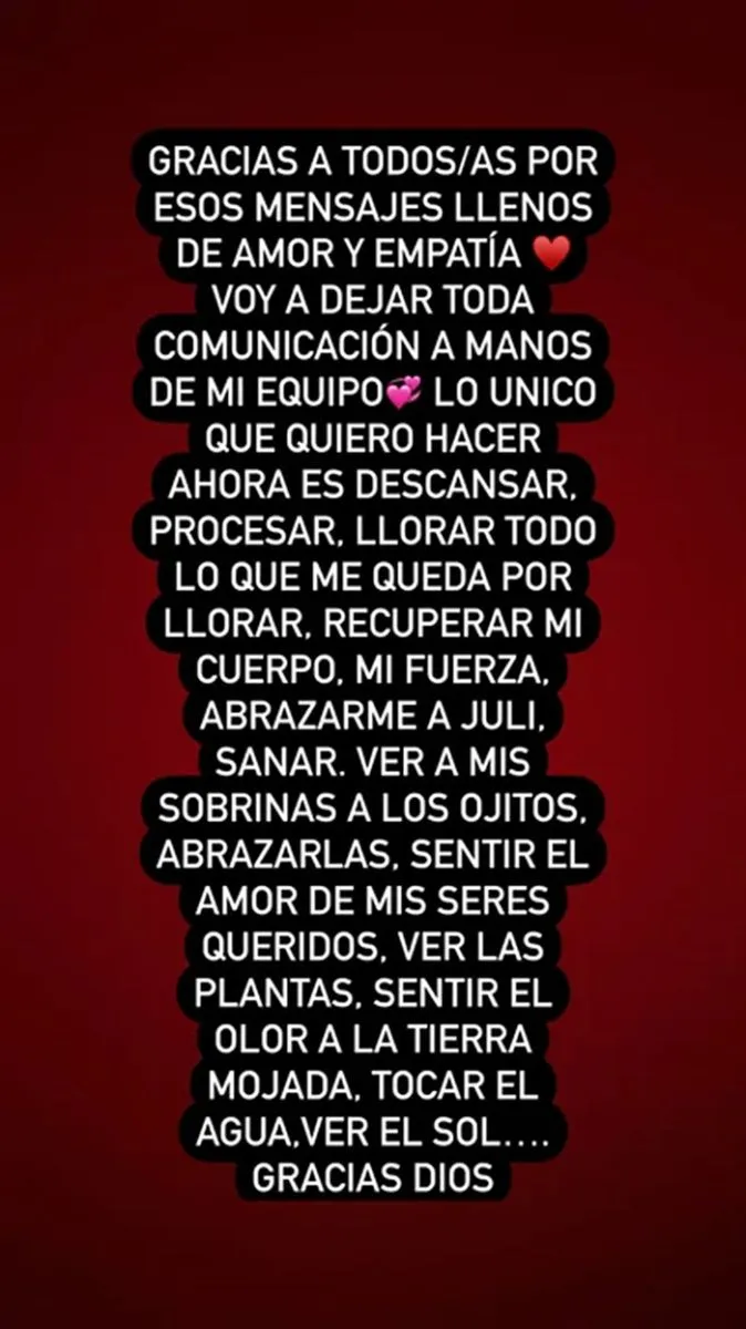 En otro mensaje, Becerra agregó: "Gracias a todos/as por esos mensajes llenos de amor y empatía. Voy a dejar toda comunicación a manos de mi equipo. Ahora solo quiero descansar, procesar, llorar lo que necesite, recuperar mi cuerpo y mi fuerza, abrazarme a Juli, sanar, ver a mis sobrinas, sentir el amor de los míos, ver las plantas, tocar el agua y ver el sol".