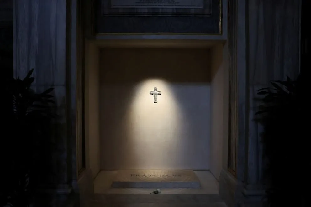 Sobre la piedra de mármol se lee apenas una palabra: "Franciscus". Nada más. Ni títulos, ni honores, ni fechas. Encima, como una sombra protectora, cuelga una reproducción de la vieja cruz de hierro que acompañó su pontificado, símbolo visible de su anhelo de humildad, incluso frente a la eternidad. El lugar destila una sobriedad que conmueve e invita a reflexionar.