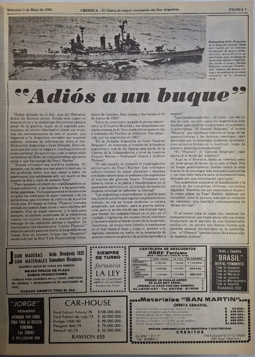 Al día siguiente, el 5 de mayo, Crónica publicó “Adiós a un buque”, reflejando el golpe al orgullo nacional: “Lamentablemente hoy ha sido un día de luto, no solo para los argentinos sino también para quienes lo conocemos, lo quisimos y lo admiramos”. El matutino destacó que el Belgrano, un símbolo de la Armada Argentina, había sido alcanzado por torpedos británicos, y que la falta de información oficial dejaba a todos con más preguntas que respuestas sobre la suerte de la tripulación.