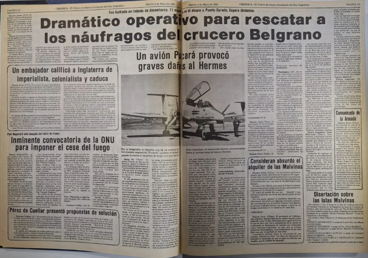 El 2 de mayo de 1982, el submarino británico HMS Conqueror torpedeó al ARA General Belgrano, a 36 millas fuera de la zona de exclusión. El 4 de mayo, Crónica tituló: “Dramático operativo para rescatar a los náufragos del crucero Belgrano”, y detalló: “Los mil cuatrocientos y dos tripulantes del ‘General Belgrano’ -socorridos por naves de la Armada Nacional a toda máquina se dirigieron a la zona donde se perpetró el artero ataque inglés”. El diario informó que el crucero se hundió rápido, con una escora de 60° a las 16:50, y que en diez minutos ya estaba bajo el agua, dejando claro el impacto del ataque.