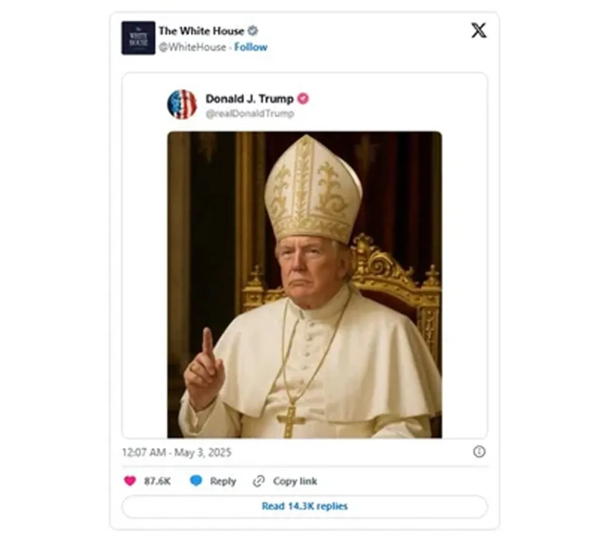 “Me encantaría ser Papa. Él sería mi primera opción”, dijo Trump el pasado martes a periodistas, tras el fallecimiento del papa Francisco y a menos de una semana del inicio de la elección del nuevo pontífice. La difusión de la imagen, que también fue replicada por cuentas cercanas a la Casa Blanca, encendió la controversia.