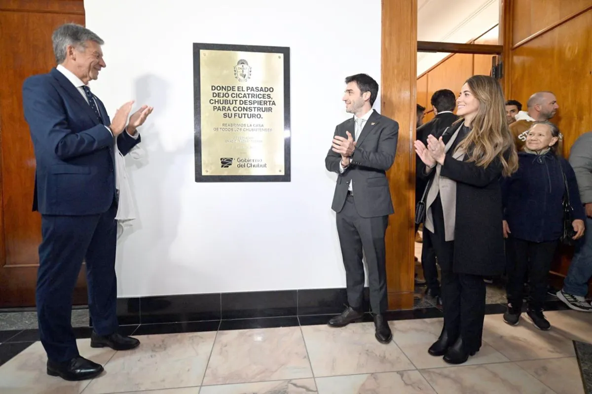 Esto reza la placa que se colocó este viernes en la Casa de Gobierno de la provincia, en lo que fue el acto de reinauguración del edificio de gobierno, que sufrió serios destrozos en el año 2021, en el marco de las protestas antimineras que se dieron luego de que el gobierno provincial aprobara el proyecto que autorizaba la minería en Chubut. El gobernador Ignacio Torres encabezó el acto junto con su pareja, Ornella Costa, y el vicegobernador Gustavo Menna.