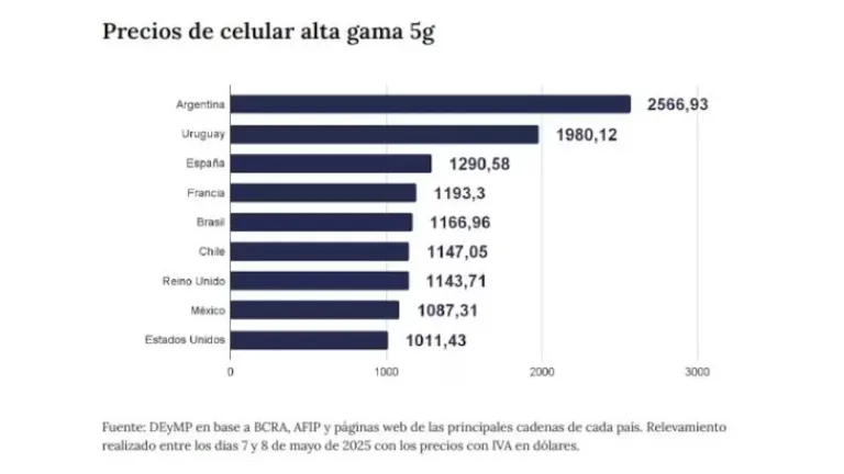 Celular de alta gama: "Actualmente, cuesta US$2566 y podría pasar a costar US$2052,80 con una baja del 20%, o US$1924,50 si la reducción alcanza el 25%".
