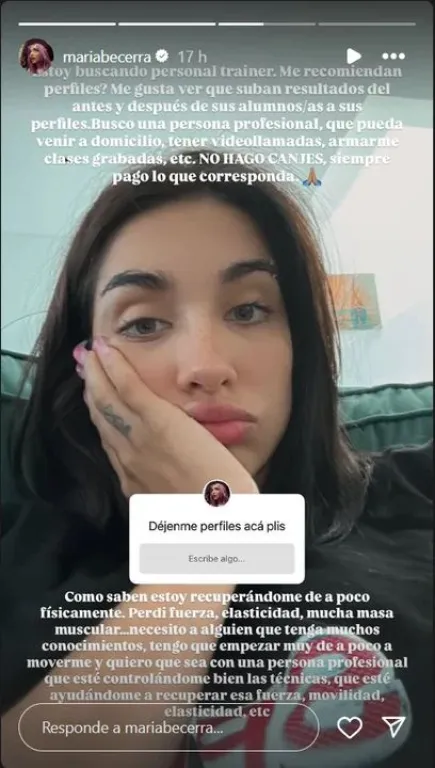 A través de sus redes sociales, Becerra pidió ayuda a sus seguidores para encontrar un entrenador personal. “Estoy buscando personal trainer. Busco una persona profesional, que pueda venir a domicilio, tener videollamadas, armarme clases grabadas, etc. NO HAGO CANJES, siempre pago lo que corresponda”, escribió en sus historias de Instagram.