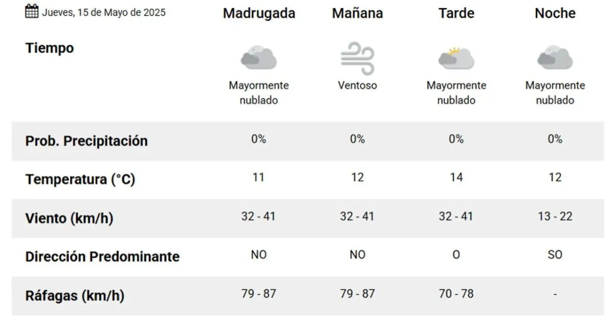 En la tarde, el Servicio Meteorológico Nacional indica una ligera disminución en la velocidad del viento, con una máxima que llegará a los 14°C y cielos muy nublados. No se esperan lluvias. Por la noche, la temperatura descenderá a 12°C, brindando un clima más agradable.