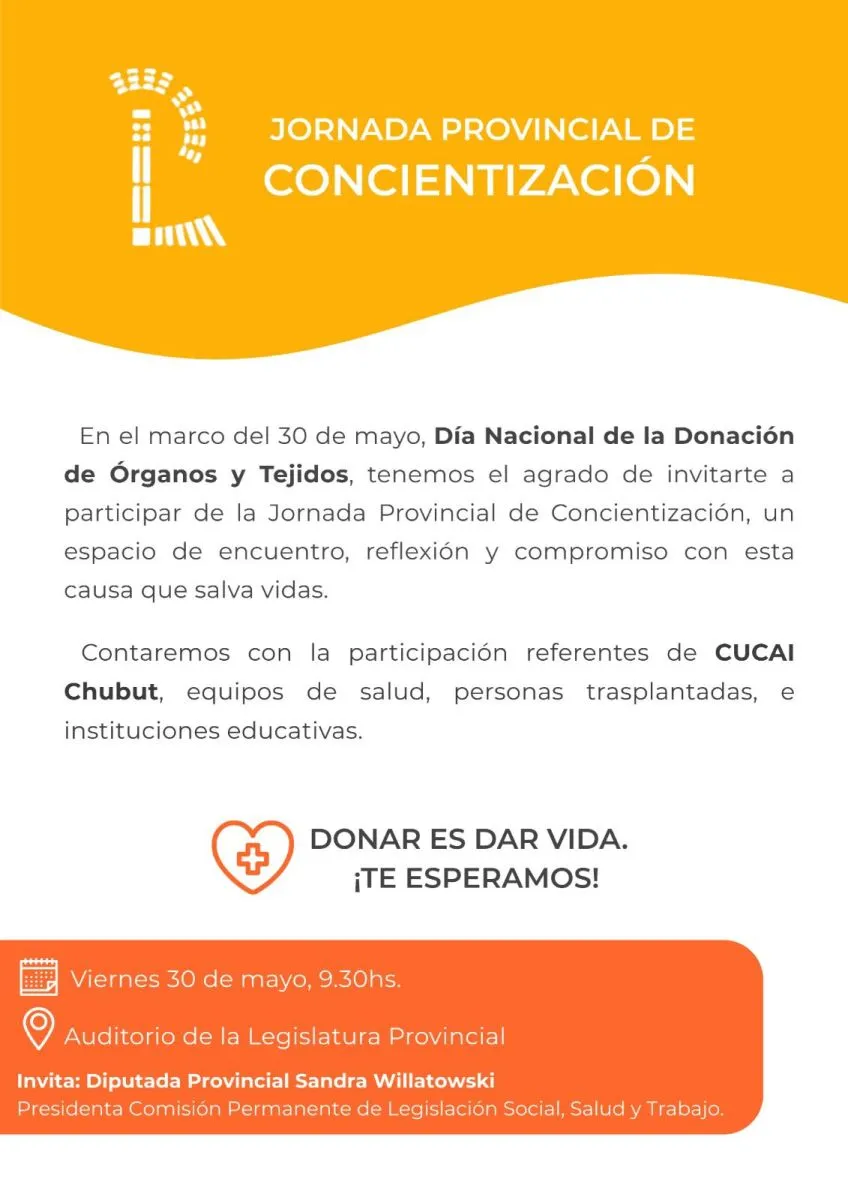La actividad, organizada por la diputada provincial Sandra Willatowski (bloque Despierta Chubut), se llevará a cabo este viernes 30 de mayo a las 9:30 en el Auditorio de la Legislatura, en Rawson. Participarán autoridades provinciales, equipos de salud, personas trasplantadas, familias donantes e instituciones que forman parte del sistema de donación y trasplante.