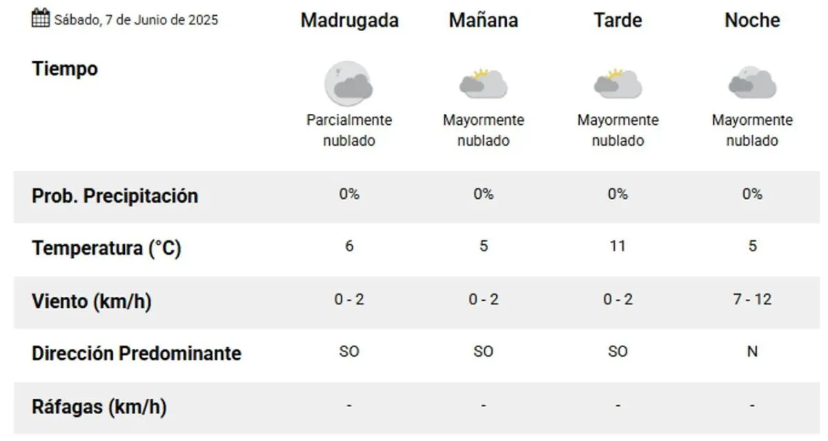 El Servicio Meteorológico Nacional anticipó que por la madrugada habrá 6° con cielo parcialmente nublado, mientras que hacia la mañana aumentará la nubosidad, pero bajará la temperatura y marcará una mínima de 5°.