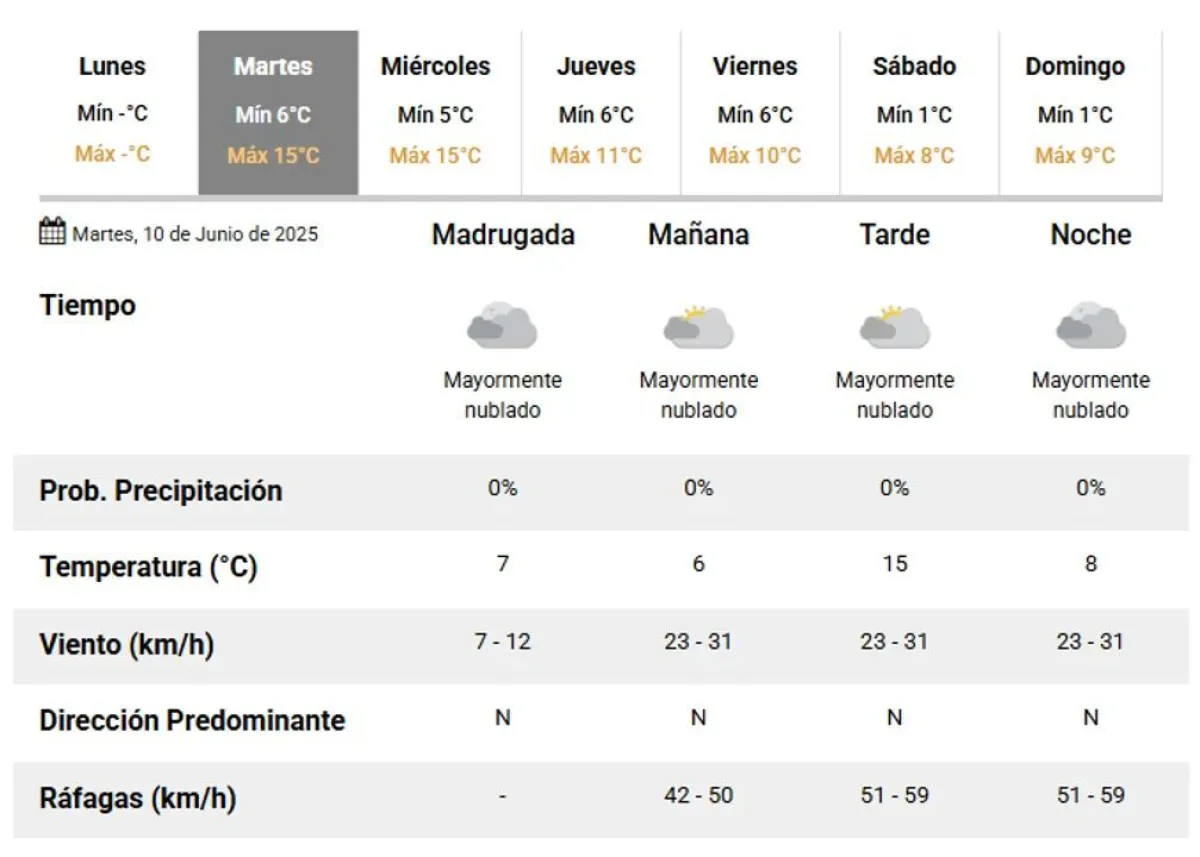 Se anticipa un día fresco y mayormente nublado, con una mejora esperada hacia la tarde. La temperatura máxima alcanzará los 12 grados, mientras que los vientos serán suaves, provenientes del este y del norte.