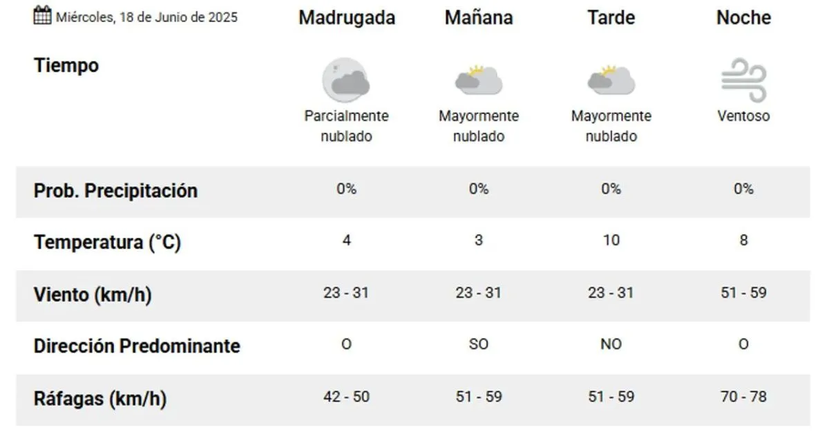 Durante la madrugada, el cielo estará parcialmente nublado con 4° y vientos del oeste entre 42 y 50 km/h. En la mañana, la temperatura mínima será de 3°, con mayor nubosidad y sin posibilidad de lluvias, aunque las ráfagas aumentarán ligeramente.