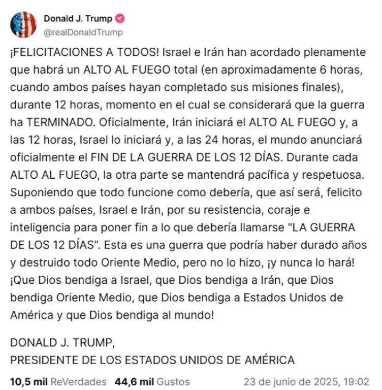 En un extenso mensaje en su red Truth Social, Trump explicó que la primera etapa de la tregua será iniciada por Irán; cumplidas las primeras 12 horas, Israel activará la suya y, al llegar a las 24 horas, la comunidad internacional “saludará el final de la Guerra de los 12 Días”.