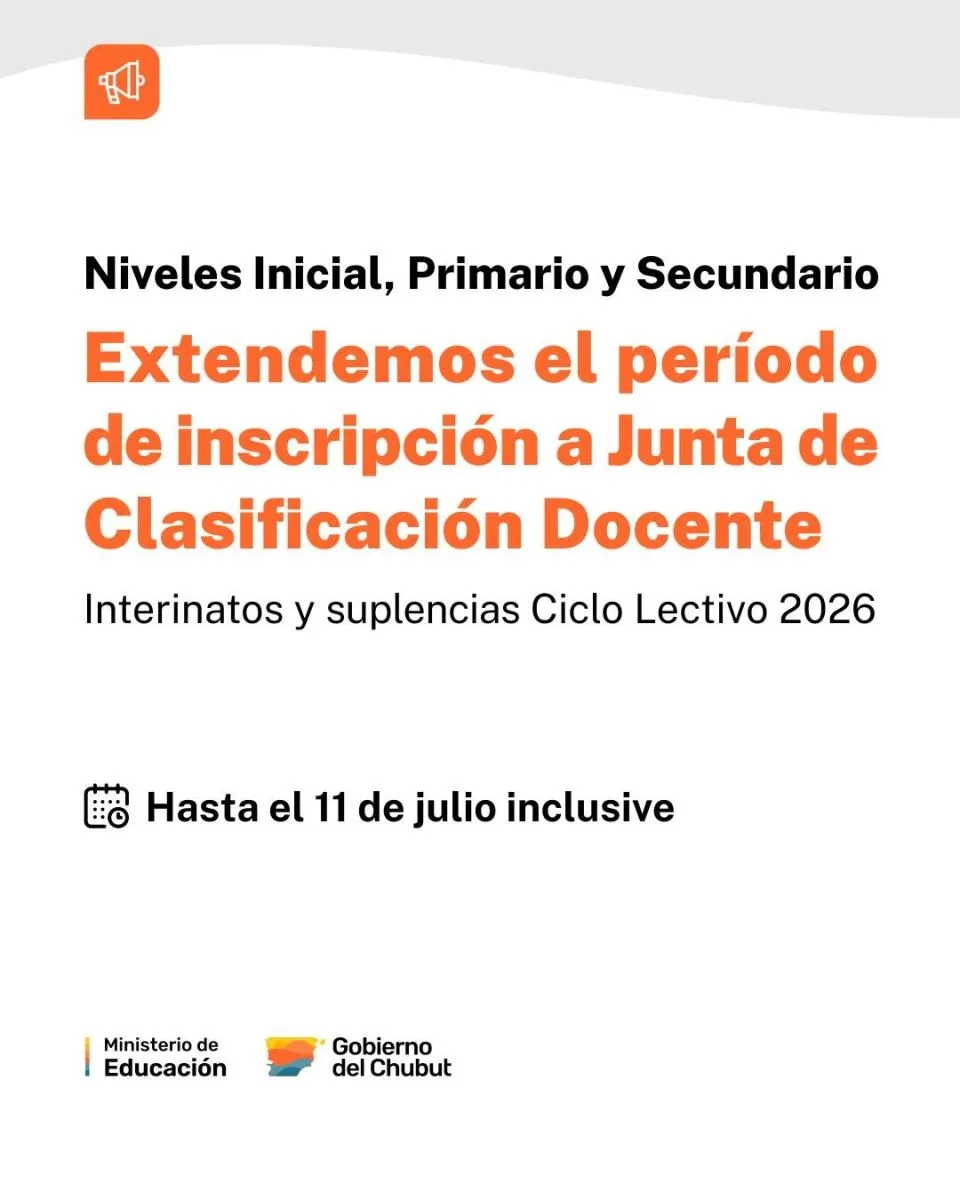 El Ministerio de Educación de la Provincia del Chubut informa que se ha dispuesto la prórroga del período de inscripción para Interinatos, Suplencias, Doble Función y Cargos Jerárquicos correspondientes al ciclo lectivo 2026, para los niveles Inicial, Primario y Secundario. El nuevo plazo de inscripción se extenderá hasta el 11 de julio inclusive.