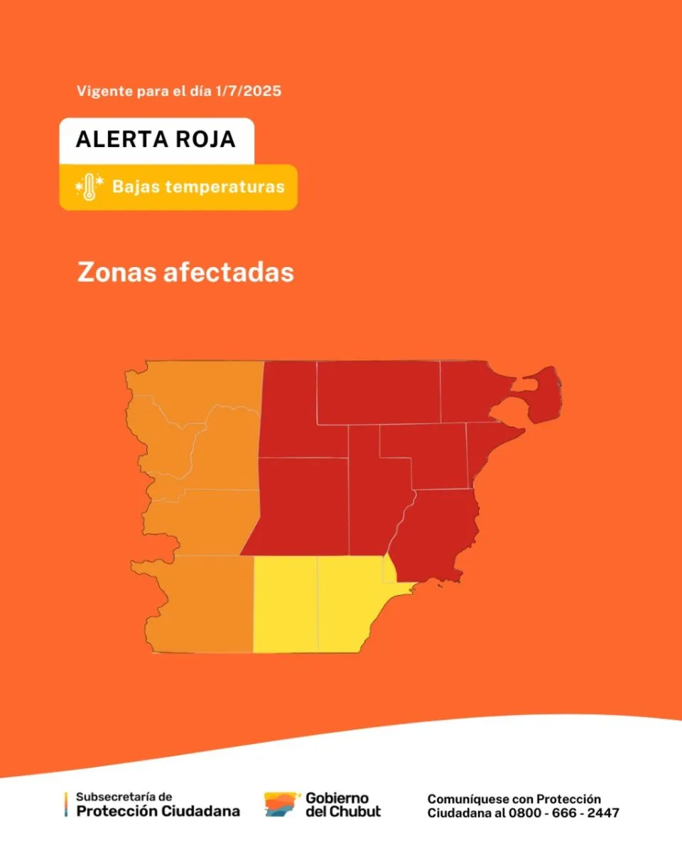 El Ministerio de Educación del Chubut informó la suspensión de actividades escolares en todas las instituciones educativas —de todos los niveles y modalidades— de las regiones comprendidas entre la I y la V, debido a la alerta roja emitida por la Subsecretaría de Protección Ciudadana. La medida aplica para este martes 1º de julio.