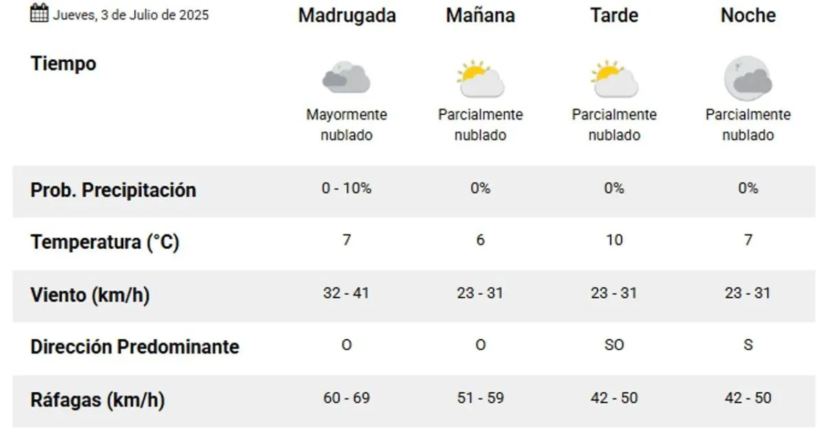 Durante la tarde, se prevé que la temperatura máxima llegue a los 10°, manteniendo condiciones similares, pero con ráfagas provenientes del sudoeste que oscilarán entre 42 y 50 km/h.
