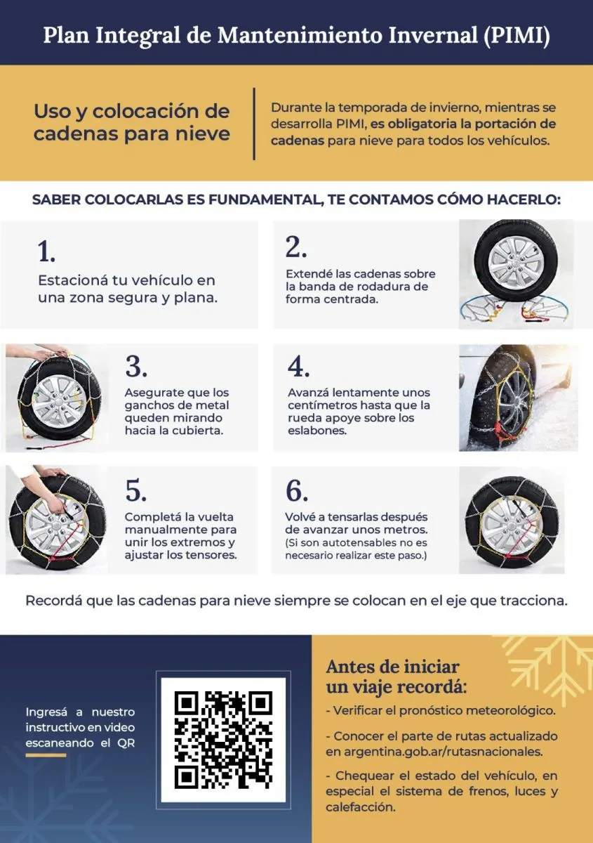 La Dirección de Vialidad Nacional informa que, en el marco del Plan Integral de Mantenimiento Invernal (PIMI), es obligatoria la portación de cadenas para nieve para todos los vehículos que circulen por las rutas nacionales durante la temporada de invierno.