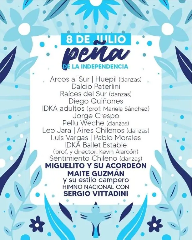 La peña contará con una destacada grilla de artistas locales y regionales, como Arcos del Sur, Huepil, Raíces del Sur, Leo Jara, Pellu Weche, Jorge Crespo, entre muchos otros. También participará el cantante lírico Sergio Vittadini, quien cerrará la jornada entonando el Himno Nacional a la medianoche, en la previa del Día de la Independencia.
