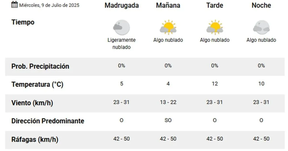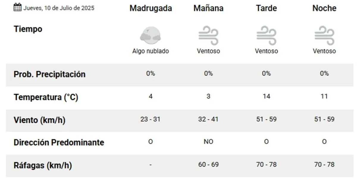 Sin embargo, se anticipa un cambio brusco en el clima para el jueves, con intensas ráfagas del oeste durante la tarde y noche del 10 de julio.