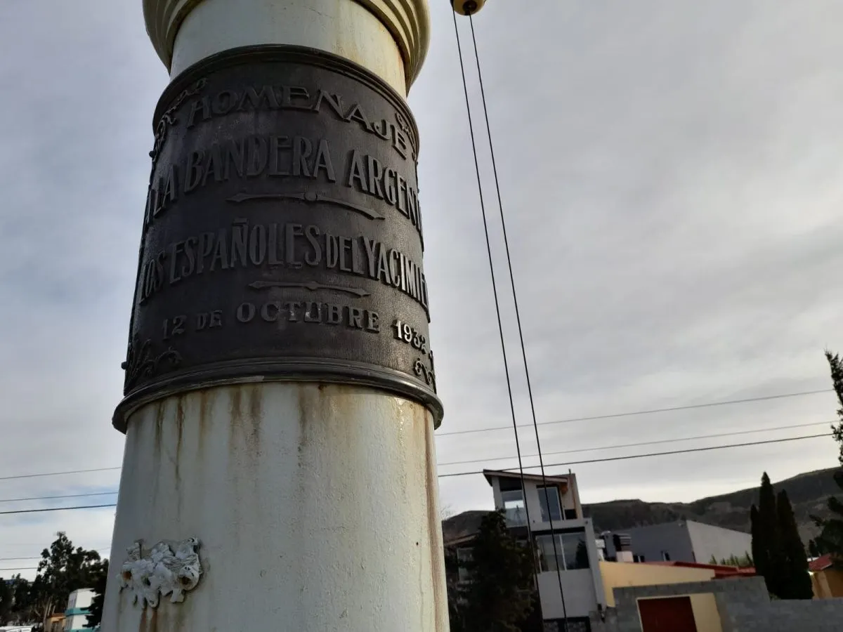 El mástil, una estructura robusta y prominente, fue erigido por la colectividad española en 1932, un 12 de octubre, para homenajear a la Argentina por las oportunidades brindadas. En su base, una placa perenne reza: "Agradecimiento a la bandera argentina, los españoles del yacimiento". Este gesto simbolizaba el profundo aprecio por el trabajo, las viviendas y la posibilidad de formar una familia que encontraron en estas tierras, gracias a la acogida de la ciudad y de la petrolera YPF.