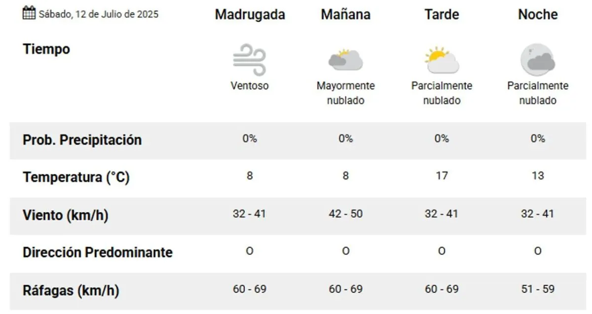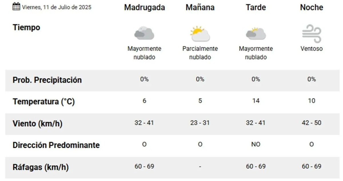 }Se prevén ráfagas moderadas del oeste, alcanzando entre 60 y 69 kilómetros por hora. Por la mañana, la temperatura mínima será de 5° con algo de sol, y se espera una pausa en el viento durante algunas horas.