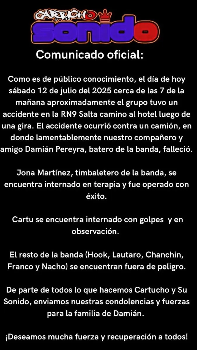 "Como es de público conocimiento, el día de hoy sábado 12 de julio del 2025 cerca de las 7 de la mañana aproximadamente el grupo tuvo un accidente en la RN9 Salta camino al hotel luego de una gira.