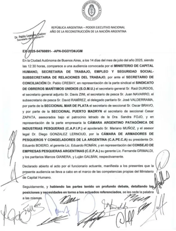 Según se conoció esta tarde, que el SOMU (Sindicato de Obreros Marítimos Unidos) y las cámaras pesqueras no llegaron a un acuerdo y se volverán a reunir el viernes. El encuentro había comenzado pasadas las 14:00 en la sede de la Secretaría de Pesca de Nación, entre representantes del gremio de los marineros y las cámaras empresarias CAPIP, CAPeCA y CEPA.