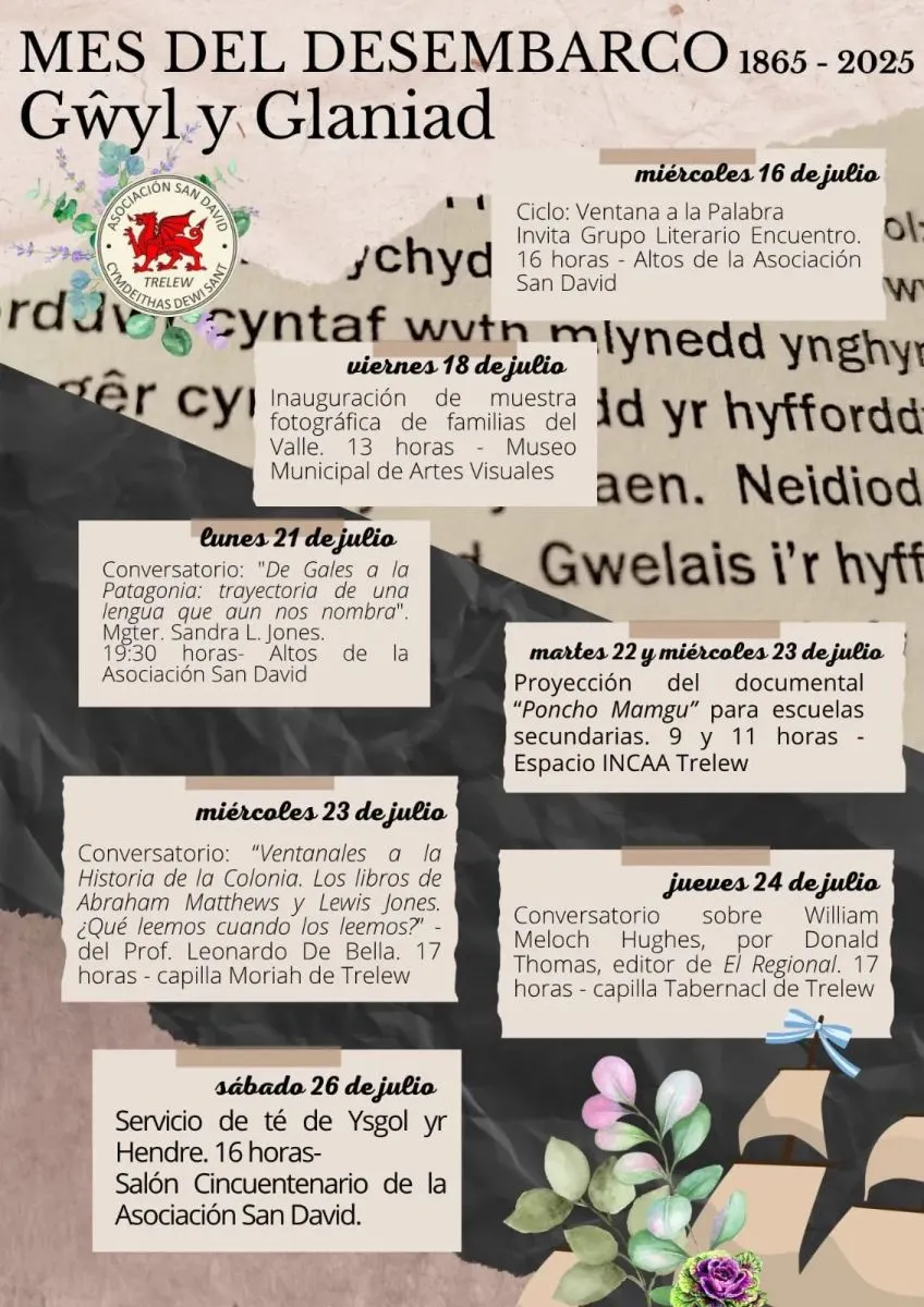 La agenda incluye charlas, muestras, circuitos patrimoniales, conciertos, cine y un tradicional servicio de té galés, entre muchas otras propuestas que se desarrollan durante todo julio. Además, los contenidos se pueden seguir a través de las redes sociales de la Asociación San David.