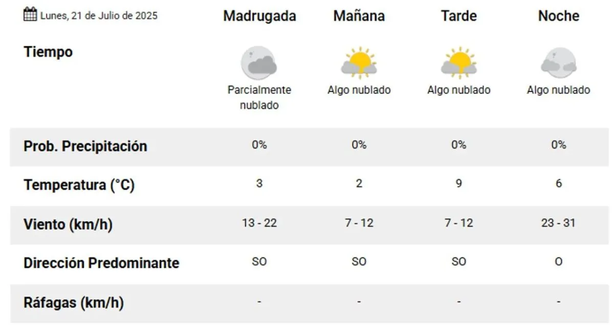 Para el lunes, se prevé un descenso en la temperatura que no superará los 10°, con cielo algo nublado y sin posibilidades de viento ni lluvias, disfrutando de otra jornada soleada.