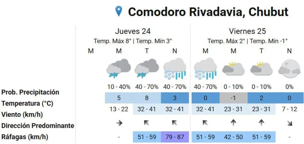 El pronóstico del Servicio Meteorológico Nacional anticipa un jueves inestable para Comodoro Rivadavia y Rada Tilly, con probabilidad de lluvias aisladas hacia la tarde que, por la noche, podrían transformarse en una mezcla de lluvia y nieve.