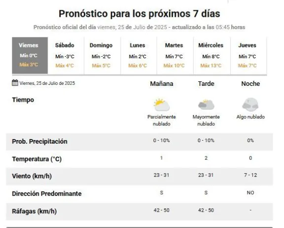 El Servicio Meteorológico Nacional pronostica un viernes muy frío en Comodoro Rivadavia, con temperaturas que no superarán los 3°C durante el día. Desde la mañana, el cielo se mantiene parcialmente nublado, con registros que rondan el grado bajo cero y viento del sur soplando entre los 23 y 31 km/h, con ráfagas que podrían alcanzar los 50 km/h.