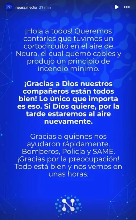 Neura Media agradeció la rápida intervención de los Bomberos de la Ciudad, efectivos de la Policía y personal del SAME, quienes acudieron para controlar la situación.