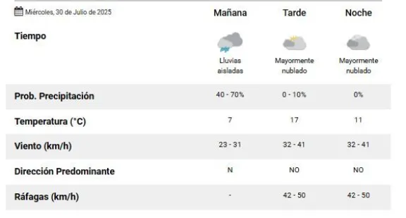 Para la noche, el panorama se mantiene mayormente nublado, con una temperatura de 11°C y sin probabilidades de precipitaciones. El viento seguirá soplando desde el noroeste, con intensidades similares a la tarde y ráfagas que rondarán los 50 km/h.