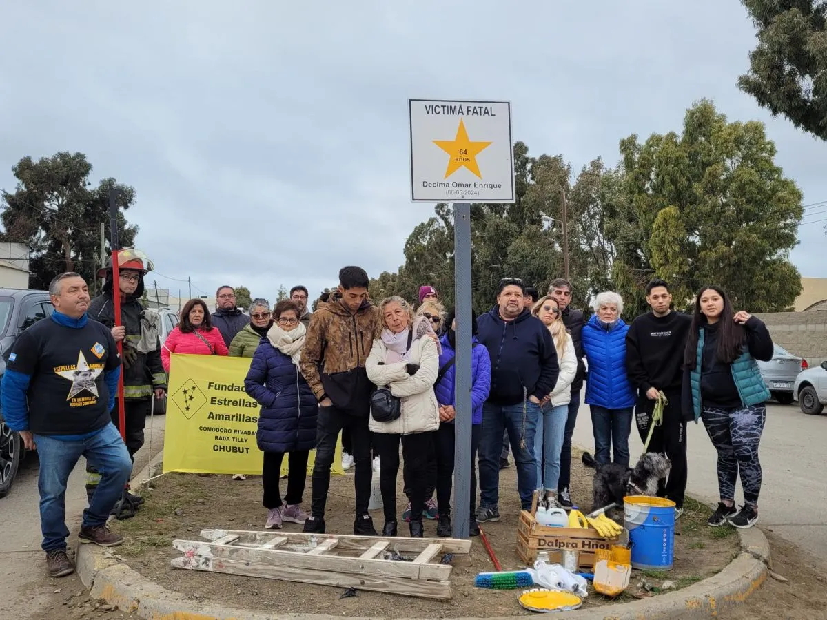 En este marco, Pablo Contreras, referente local de la Fundación Estrellas Amarillas, precisó: “Hoy dejamos inaugurada la estrella número 11, que pertenece a Decima Omar Enrique, quien perdió la vida acá en este lugar, en Gatica y Ruta 3, Yrigoyen, con 64 años de edad, víctima de un choque”. Junto a su familia, se dejó instalada esta nueva estrella.