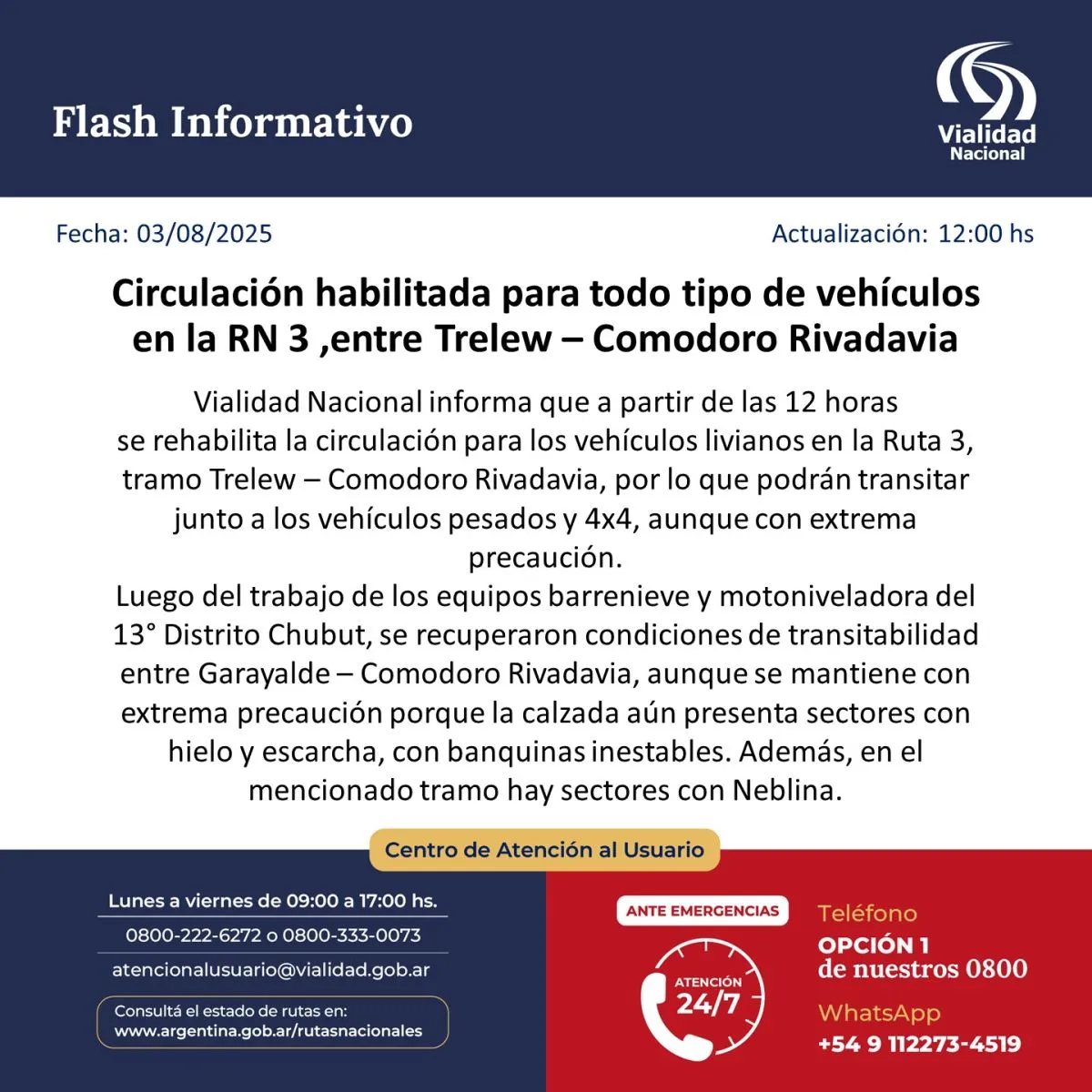 Vialidad Nacional comunicó este domingo que a partir de las 12 horas quedó habilitada la circulación para todo tipo de vehículos en el tramo de la Ruta Nacional N°3 entre Trelew y Comodoro Rivadavia, que permanecía restringida para vehículos livianos debido a las condiciones invernales.