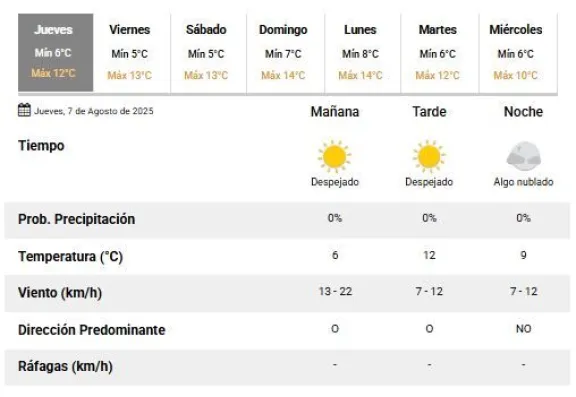 El Servicio Meteorológico Nacional anticipa para este jueves 7 de agosto una jornada con tiempo estable en Comodoro Rivadavia, sin fenómenos adversos a la vista. Desde las primeras horas del día, el cielo se presentará ligeramente nublado, pero a medida que avance la mañana se espera una mejora con cielo mayormente despejado.